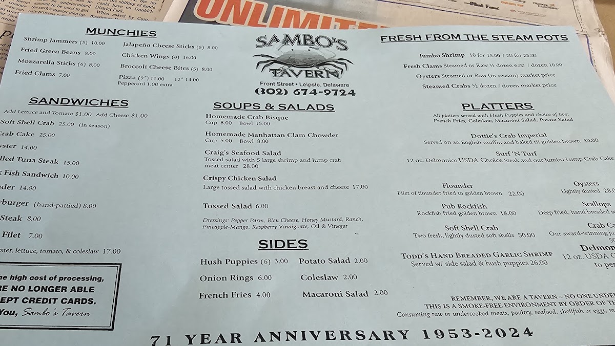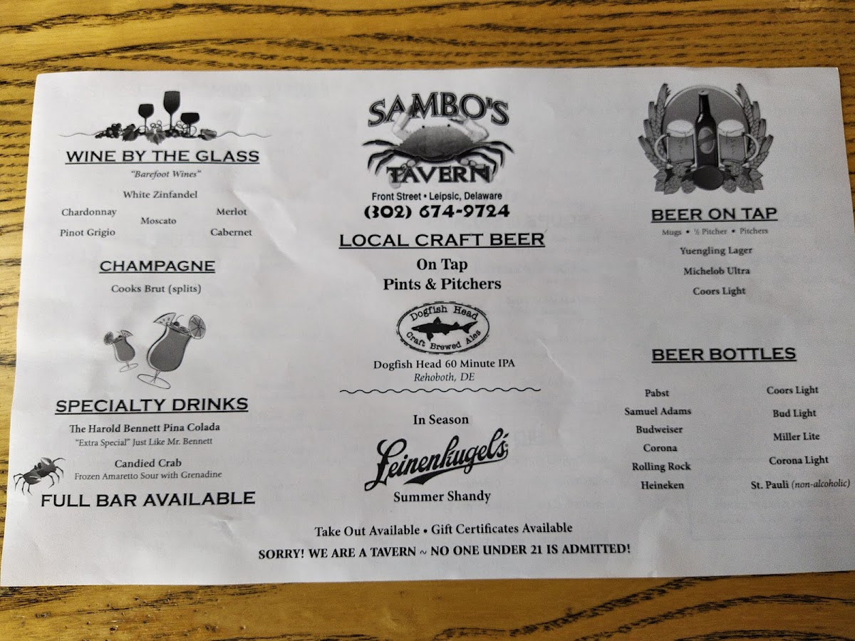 Sambo's Tavern offers a straightforward, no-fuss menu focused on fresh, local seafood served in a relaxed tavern setting. The menu features classic crab house staples such as steamed crabs, oysters, and crab cake sandwiches alongside other casual favorites like fried green beans and honey fried chicken. Simple, comforting dishes are designed to be enjoyed in an easygoing atmosphere where the emphasis is on good food and conversation.